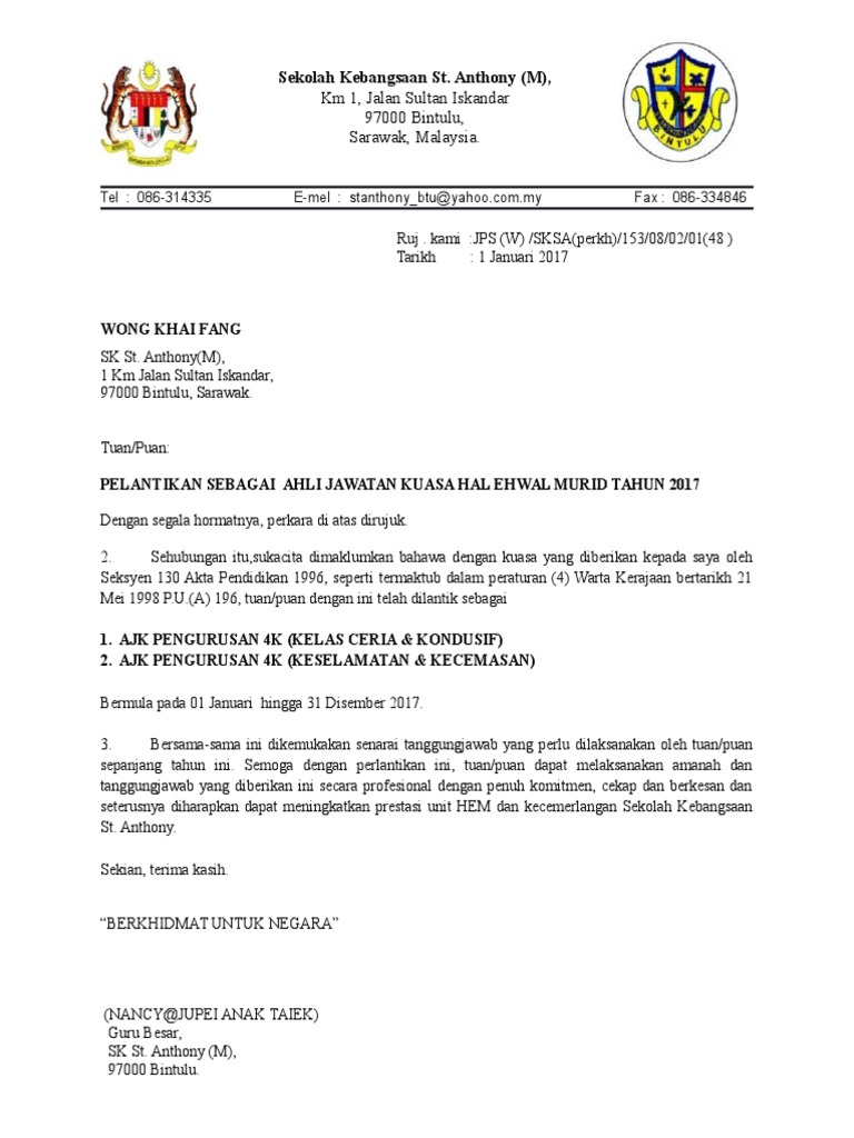Contoh Surat Lantikan Ajk Pibg